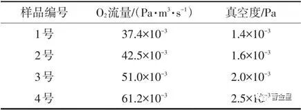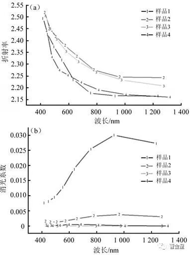 电子束蒸发镀制TiO2薄膜,采用下图所示的离子束辅助电子束蒸发的INTEGRITY-39全自动光学镀膜系统。1.冷却水进口;2.冷却水出口;3.坩埚;4.束流线圈;5.电子束发射器;6.加热灯;7.基片架;8.电机;9.监控片;10.离子源 镀制样品电子枪工作电压为10 kV,电流为200 A,真空室沉积温度为145~155℃。膜料选用纯度为99.99%的黑色颗粒状Ti2O3,采用CC-105冷阴极离子束进行辅助沉积,沉积时真空室充入纯度为99.99%的O2作为反应气体,同时使用1179A型MKS质量流量计控制反应气体O2的流量,基底为直径25 mm的圆形K9玻璃。 镀膜前基底先用玻璃液清洗,去离子水漂洗,氮气吹干,然后用纯度为99.9%的丙酮、无水乙醇超声波各清洗15 min,用专用擦拭纸擦干后装入真空室。 镀制时用机械泵和扩散泵将真空度抽至6.5×10-4Pa时,设定自动镀制程序。当基底被加热到沉积温度150℃时,离子源开始轰击基底,能量控制在60~90 eV,时间10 min。然后自动启动电子枪加热蒸发膜料,沉积薄膜,沉积速率0.38~0.42 nm/s,薄膜沉积到设计厚度440 nm时,程序自动关闭电子枪,完成镀制。 镀膜后真空室自然冷却到室温取出样品,用Lambda900(测试范围为175~3 300 nm)分光光度计进行样品TiO2的光谱测试,采用Macleod软件包络法计算TiO2薄膜的实际厚度,消光系数和折射率。 对真空室通入不同流量的高纯氧气,研究不同的真空度对TiO2的成膜质量、折射率、吸收系数的影响。 在较高的真空度下用离子源辅助蒸发沉积TiO2薄膜时,真空度随通氧量的变化如下表所列。 随着充入真空室内的氧分子被电离成氧离子充分与Ti2O3蒸气分子反应,使得Ti2O3分解所失的氧得到补充,从而生成的薄膜中TiO2成分比较纯净,但是如果通氧量不足或Ti2O3与O2反应不充分,则会形成高吸收的亚氧化钛薄膜TinO2n-1(n=1,2,……,10)。随着通氧量的增加,TiO2蒸气分子在蒸发上升过程中与氧分子的碰撞几率增大而损失了能量,使沉积在基底表面的TiO2动能减小,影响沉积薄膜的附着力和致密性。 对于光学薄膜而言,采用离子源辅助能够增加基底表面膜层分子的动能,不仅对薄膜的折射率有明显的影响,而且能使薄膜致密性及耐潮湿性得以提高,同时薄膜在基底上的附着力也有明显好转。 采用Lambda900分光光度计测试4个样品的光谱,光谱图如下图所示。从图中可以看出,1号样品的TiO2薄膜明显存在吸收,最高透射率为81%;2号样品的透射率较1号有明显提升,最大透射率为90%;3号样品的最大透射率为92%,与基底的透射率基本相同,基本没有吸收;4号样品最大透射率也为92%;但是峰值和谷值之差减小,材料的折射率减小。 对于镀制在可见区高透射率光学膜系,材料的吸收系数不能太大,否则将影响薄膜产品的最终透射率,使产品的光学性能降低;同时折射率也不能太低,否则对膜系设计时截止带的宽度等造成影响。 包洛线法由Manifacier在1976年提出,是通过膜层光学厚度为λ/4整数倍处的透射率(或反射率)极值反演计算膜层的光学薄膜参数。在实际测量过程中,首先分别连接透射率极大值Tλ/2点与极小值Tλ/4点形成Tmax(λ)和Tmin(λ)两条包络线;然后通过包络线上取点获得任意波长位置透射率极值Tλ/2和Tλ/4;最后利用透射率极值计算膜层的消光系数和折射率,并依据折射率计算值和极值点波长求解膜层的厚度。 该方法的优点是测量过程简单,可同时测量膜层的折射率、消光系数和厚度,测量过程不需要与薄膜样品接触,利于样品保护,是一种理想的对比各种设备测试结果的方法,如果使用得当,可以作为确定薄膜所有光学常数的手段。 采用包络线的方法,计算薄膜在波长λ处的线性折射率n和厚度L。 式中:n0和n1分别是空气和基底的折射率;Tmax和Tmin是在波长λ处的最大和最小透射率;λ1、λ2和n(λ1)、n(λ2)分别对应透射率曲线2个相邻峰值或谷值的波长和折射率。利用Macleod软件,用包络线法计算TiO2薄膜的折射率和消光系数。 从下图(a)中可以看出,光谱范围由紫外-可见-近红外,4种样品的折射率均减小。1号样品在400~1 000 nm波段的折射率介于2.50~2.15之间。2号样品和3号样品折射率稍高,而4号样品折射率在同样波长位置稍低,介于2.45~2.15。 从上图(b)中可以看出,1号样品明显存在吸收,消光系数随着光谱范围从紫外-可见增大,可以知道有金属Ti的低价氧化物产生,原因是供氧量不足;2号样品的最大透射率明显提升,消光系数基本在2.5×10-3以下,对光谱最终透射率仍然有影响;3号样品和4号样品光谱的消光系数在10-4量级,对光谱最终透射率的影响基本可以忽略。 1号和2号样品的消光系数随波长增大而增大,其他2个样品的消光系数基本不随波长变化,在这一真空度条件下,1号和2号样品随波长增大而透射率降低,判断为此时氧含量过低,有金属Ti形成,而Ti的消光系数恰好是随波长增大而增大。 通过4种样品的对比,发现随着氧流量增加,镀制真空度降低,TiO2薄膜的折射率先升高后降低。通氧量的增加导致经过离子源电离的氧离子增加,会增加轰击薄膜的离子密度,使膜层更加致密,从而提高膜层的折射率,然而当氧气的充入量进一步增加,镀制真空度比较低时,多余的氧分子和TiO2薄膜分子的碰撞,减小了TiO2薄膜分子的动能,从而使得沉积的TiO2薄膜分子迁移速率降低,使膜层的致密度降低,也就进一步降低了薄膜的折射率。 如果通氧量较少,即镀制真空度较高时,也会造成由于氧分子的量较少,无法补充Ti2O3膜料在蒸发分解失氧时的氧含量,导致镀制的薄膜
